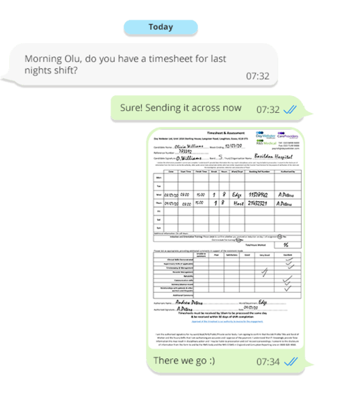 We know sometimes you may not have the time to upload and send timesheets via email. With our new WhatsApp service you can now send in an image of your timesheet directly to our payroll for processing.